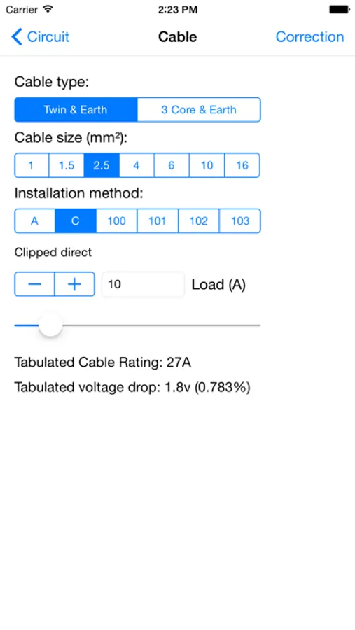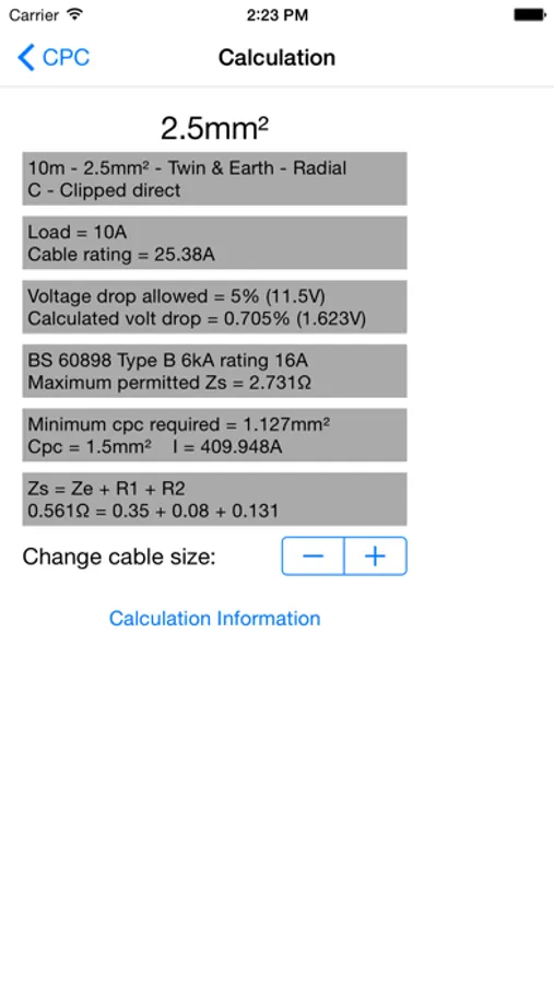 This free app will calculate ring, radial and lighting circuits wired in twin and earth or 3 core and earth pvc cable up to 16mm. Calculations and checks include current carrying capacity, volt drop, correction factors, operating temperature, maximum Zs and minimum cpc size with a detailed summary.