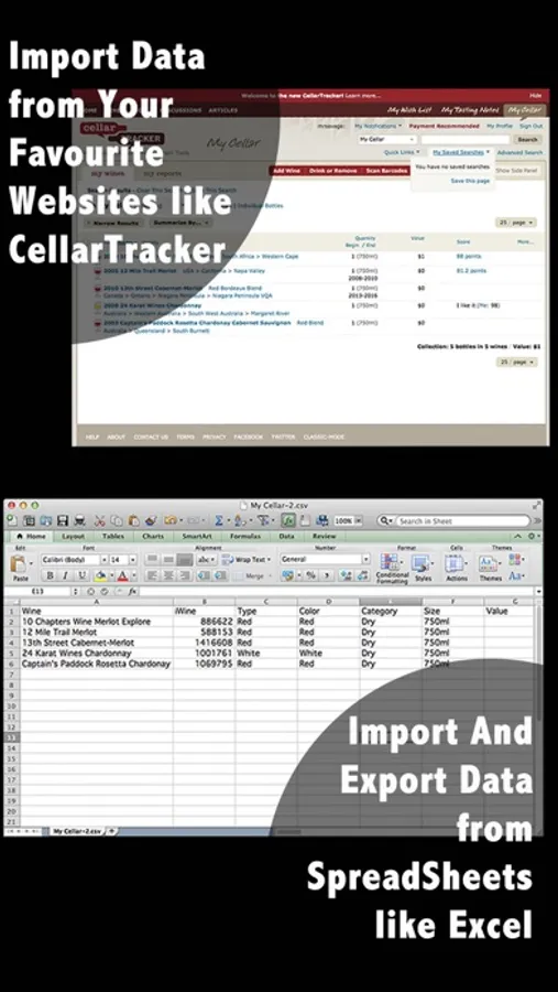 -Import and export wines to and from your spreadsheet files created by Excel or from wine website like Cellar tracker.