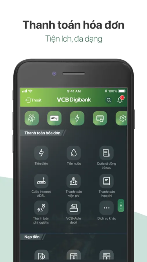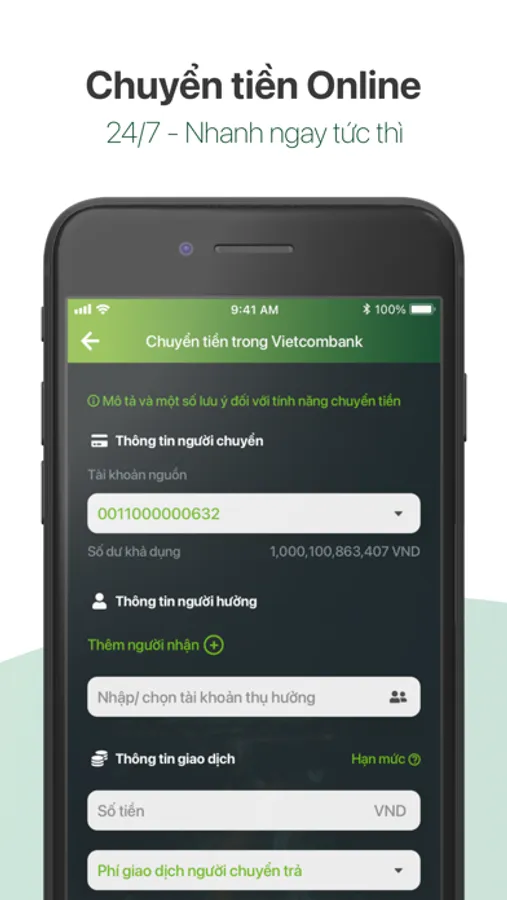 - Transfer within VCB, quick transfer 24/7, transfer outside VCB;