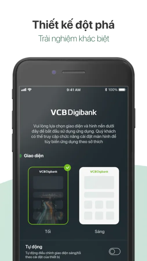 - The design style of "Dark Mode" - dark background mode - is a remarkable highlight in the design of VCB Digibank. Dark Mode is currently a prominent trend on software and operating systems today, based on the benefits of using dark background mode, especially for user health and durability of the device; and