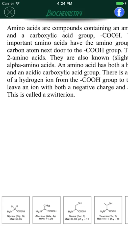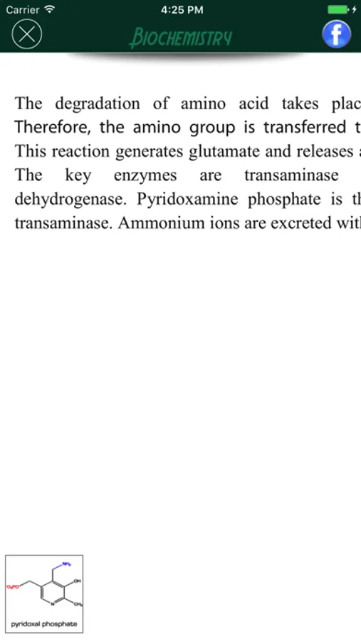 This App gives an insight into important biochemical pathways as well as essential knowledge into basic biochemistry. Furthermore, images and illustrations help the user to understand important topics easily. The user-friendly interface provides easy navigation through the topics. Not only students but also everyone else who are interested in improving their knowledge can benefit from this great App. All in all, this App provides an amazing overview of Biochemistry!