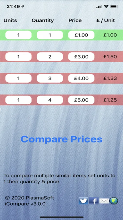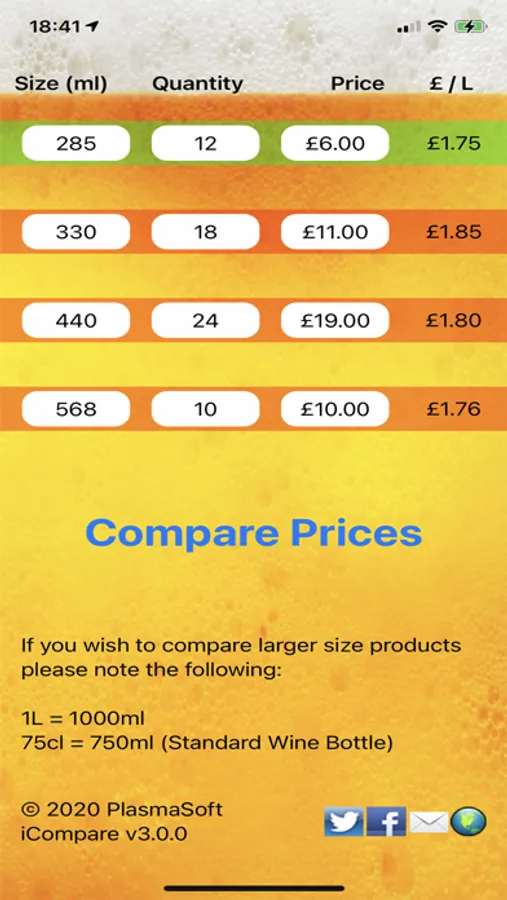 iCompare Prices is a very simple, but extremely useful application. We wrote it for those times when you are at your local Supermarket trying to decide which offer on Beer is the best one to go for. As it's not always the one with the big red Special Offer label on it, and some supermarkets don't display the price per litre. While it was initially written for comparing beer prices, you actually can use it to compare anything. It will also advise if 2 different sizes / quantities are the same value (you will get 2 or more green highlighted lines instead of the usual 1). We've added a "Normal Mode" which you can toggle between by swiping or simply shaking the device.