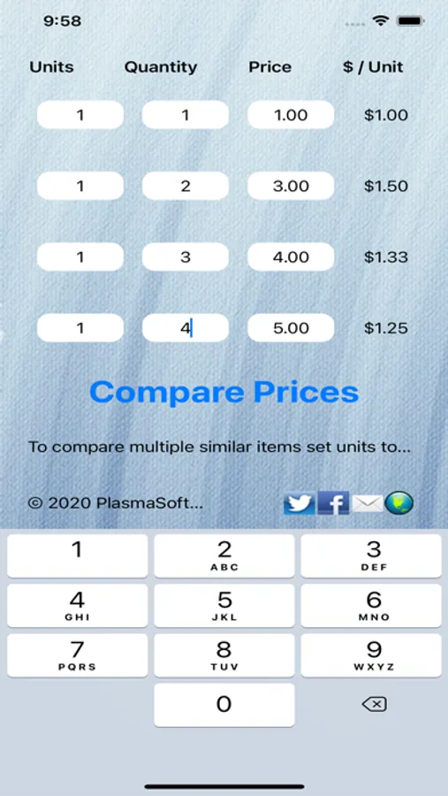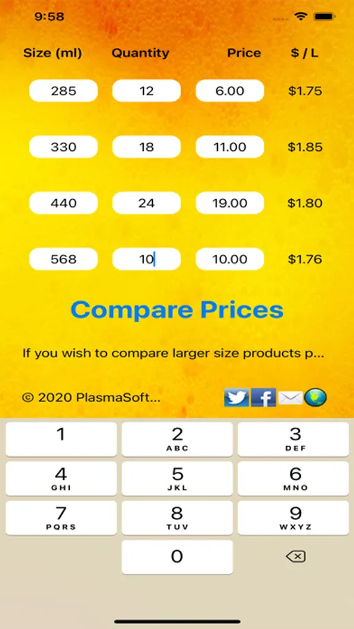 The app will save settings after each price compare, so if you always compare similar sized items you will only have to adjust the price next time. Additionally there are two sets of settings one for Beer Mode and one for Normal Mode.