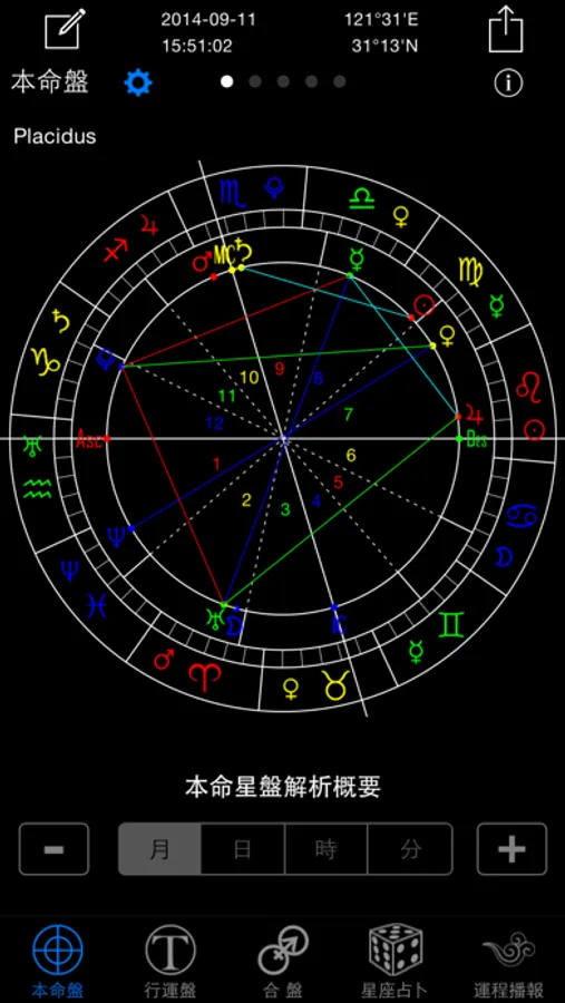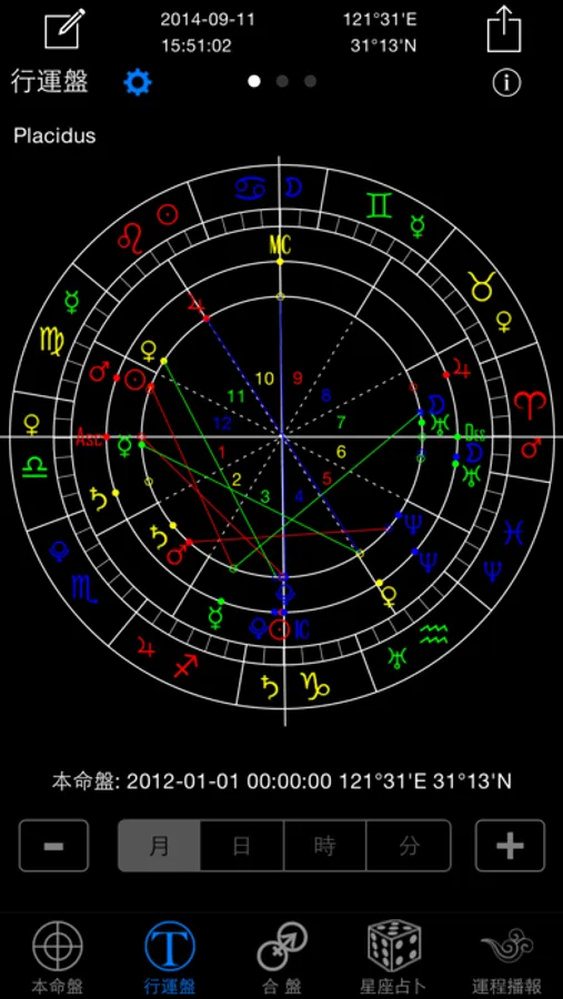 不论是本命盘还是行运盘,您都可以以月日时分为单位随意转动星盘以获取您想要的信息。此功能可帮助您纠正出生时间误差,查看未来天象变化。更方便您做研究比对之用