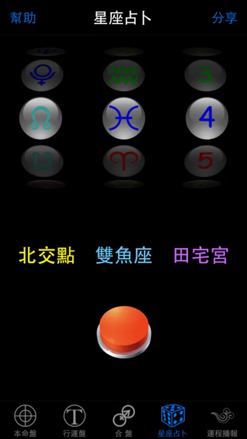 星座占卜源自于国外流行的占星骰子。使用方法为:先在心中问一个特定的问题,然后启动占卜盘。占卜盘自左向右依次代表行星、星座和宫位。占卜开始后,各栏项目会机选择 , 最后的结果将显示在下方标签处。其中: