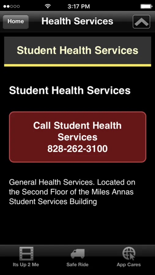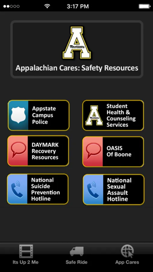 Student health and safety resources for Appalachian State University. ncludes links and telephone numbers for University Police, student health and counseling services, Safe Ride, local community resources and national hotlines, as well as the It's Up to Me video.