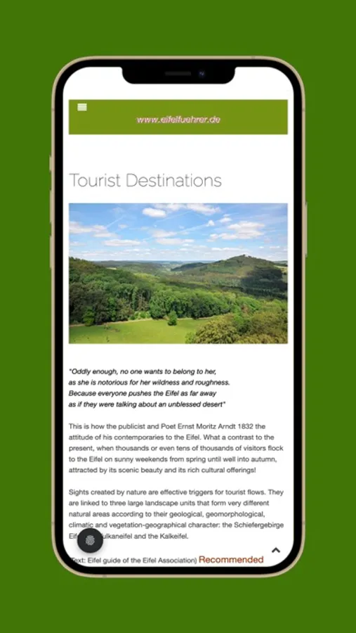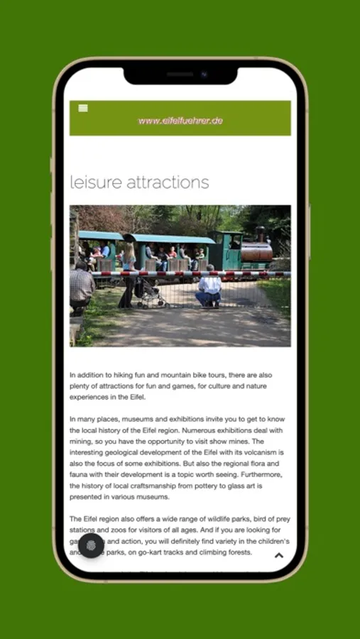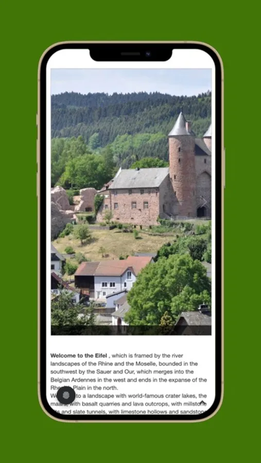 Ein Informationsmedium über die komplette Eifel zwischen Rhein und Ardennen, zwischen Mosel und Kölner Bucht. Alle Orte und Landschaften werden beschrieben und durch Fotos dargestellt: Touristische Ziele wie Maare, Seen und Wasserfälle, Vulkanberge und Aussichtspunkte, Naturparks und Naturschutzgebiete, Burgen und Schlösser, Kirchen und Klöster, Geologische Attraktionen und Geschichtliche Zeugnisse.