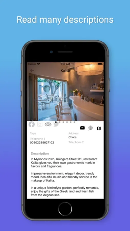 Thousands of users trust the Go! Mykonos Travel Guide for their holidays in Mykonos. It opens the door to the most interesting places of the island. This application is a really useful tool that will assist you in finding what you want in Mykonos regarding accommodation, food, cafe bars, entertainment, activities, shopping, beaches and worthseeings.