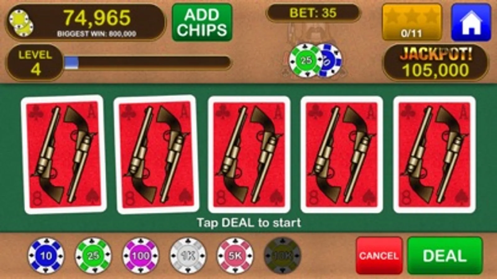 Video Poker Jackpot! brings exciting Vegas Casino style Video Poker to your fingertips anytime anywhere! The games are easy to learn, simple to navigate and most importantly, hours of fun! Simply select a game of your choice, choose a bet and start drawing cards! -