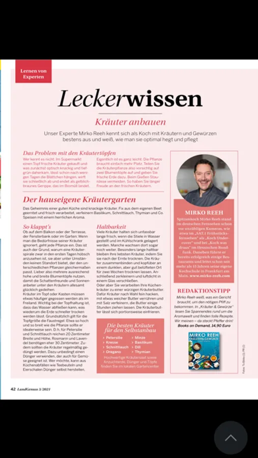 Darüber hinaus liefern sie Wissenswertes zu Garten & Deko, Veranstaltungen sowie Restauranttipps und Übernachtungsmöglichkeiten in Ihrer Lieblings-Genuss-Region. Begleiten Sie uns auf eine kulinarische Reise durch die Backstuben, Bauernhöfe, heimischen Küchen und zu den Produzenten verschiedener Regionen.