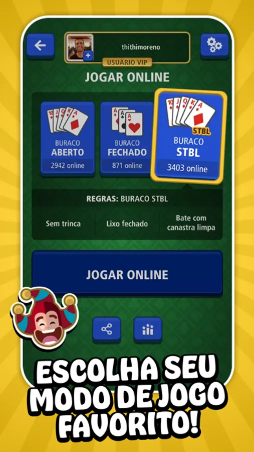 - 3 MODALIDADES DIFERENTES: escolha o seu estilo de Buraco favorito, com as opções Buraco Aberto, Buraco Fechado ou Buraco Fechado STBL (Sem Trinca, Bate Limpa).