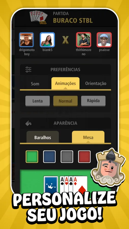 - Customize a mesa e as cartas de baralho da partida.