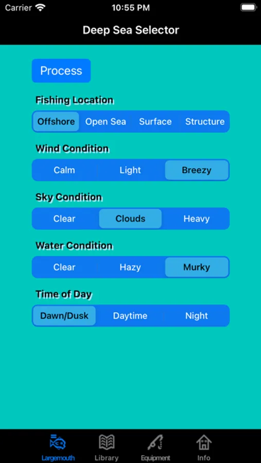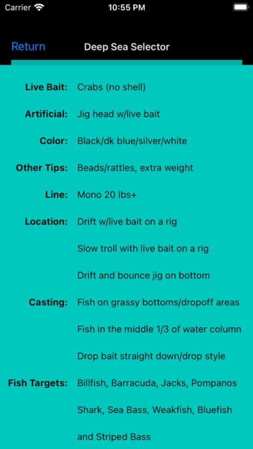 The Deep Sea Angler application is for any anglers or even charter boat customers who want to have access to a quick surf fishing assistant or guide. This quick reference will help find and catch more fish. It is designed primarily for saltwater deep sea fishing, for those who are offshore on their own boats or on a charter. The interface queries for several "conditions", then posts results based on time of year, time of day, weather, wind, water clarity and more. The results page tells anglers where to fish, the best bait to use, color, size, sound, line type, direction, location, best fish to target and more. It also has a library with details on the most common sport fish being targeted, tips and techniques. There is also an equipment section outlining tackle tips, fishing notes, rigs and more. Finally, there's a section to save your largest catch with info like where it was caught, the length, weight, bait used, and more.