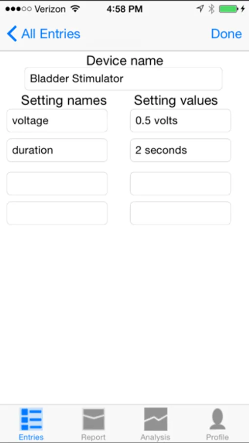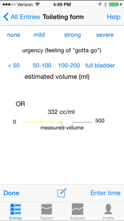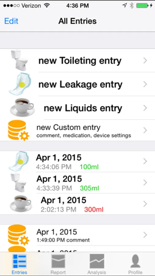 Health care providers recommend that patients with overactive bladder or incontinence keep a daily record of liquid intake and voiding details. Usually this means filling out a paper form but with this app, a few clicks on the iPhone record the information as a digital diary. Each entry can be reviewed and edited. The Report feature of the app takes the data and converts it to readable text in a PDF summary file. This file can be emailed to the physician for review and inclusion in the patient's electronic medical record.