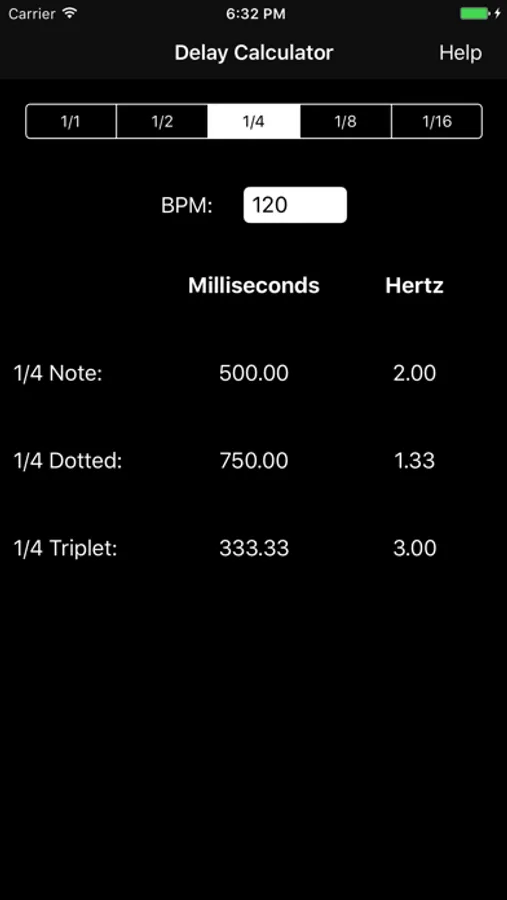 Delay Calc is musical calculator for musicians and recording engineers who need to find delay and modulation times for a Beats Per Minute Value(BPM). Users simply type in a BPM value and then can select various musical rhythmic values to get the rhythmic values in milliseconds for delay or hertz for modulation effects.