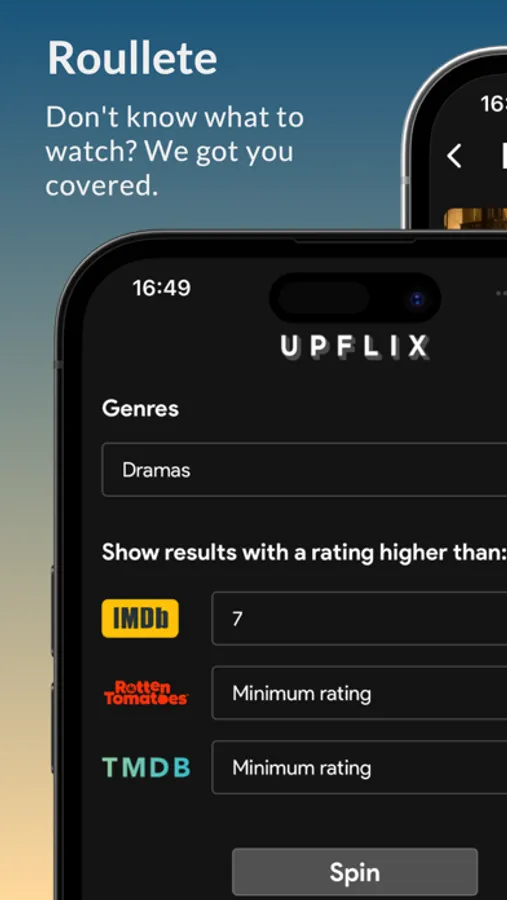 With Upflix, you'll have access to reviews and ratings from specialized websites like IMDB, Rotten Tomatoes, and TMDB, which will help you decide what to watch. If Netflix just released a series and you're not sure if it's good, just check Upflix!