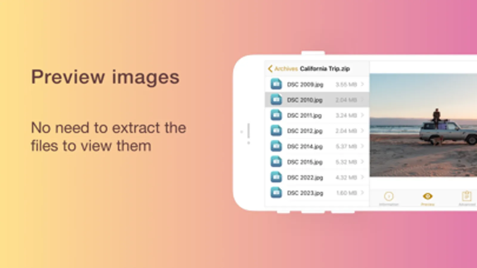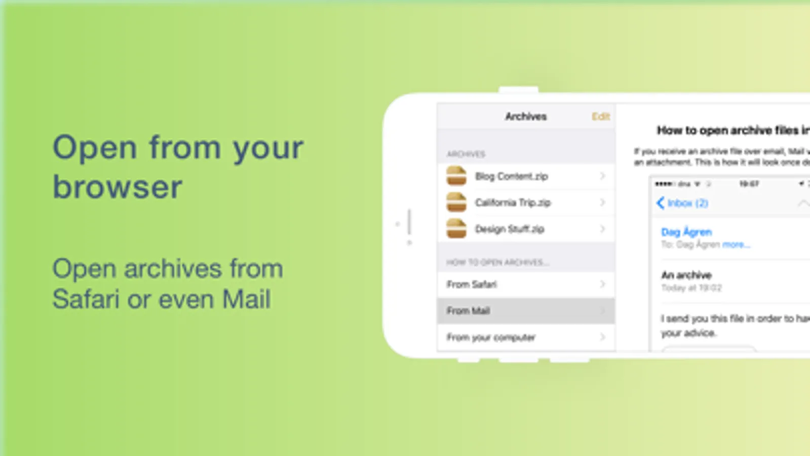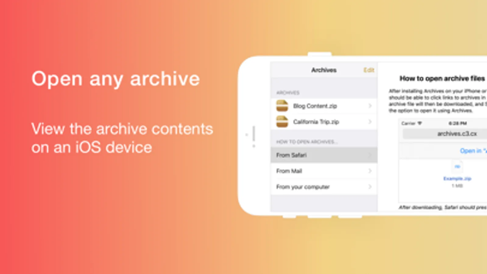 It can open files that have been mailed to you, files you encounter on the web, or even files from your computer through iTunes file sharing. It lets you preview the files inside archives, such as text, images or music. If you have another app installed that can open a file, Archives can also use that app to open contained files.