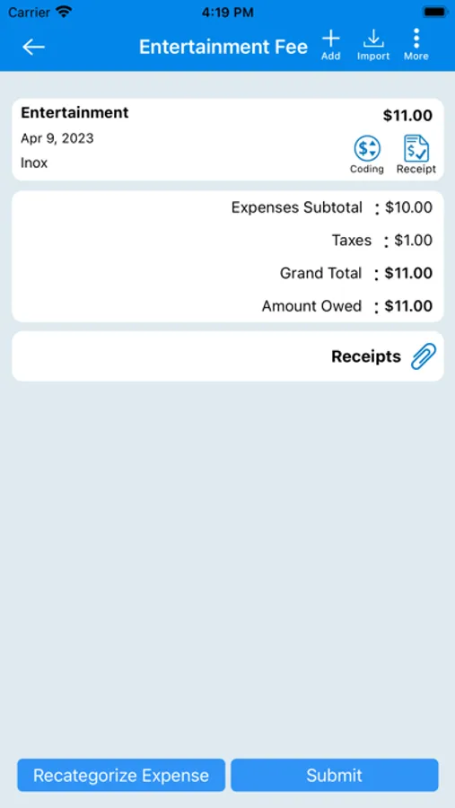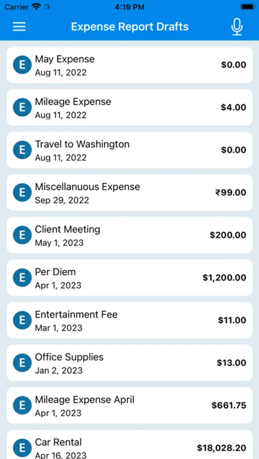 Capture receipts using the camera in your iPhone/iPad, upload them to your account, and attach them to a line item on the expense report.