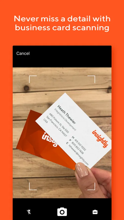 * Add new contacts on the fly, scan business cards or import them from your device’s address book
