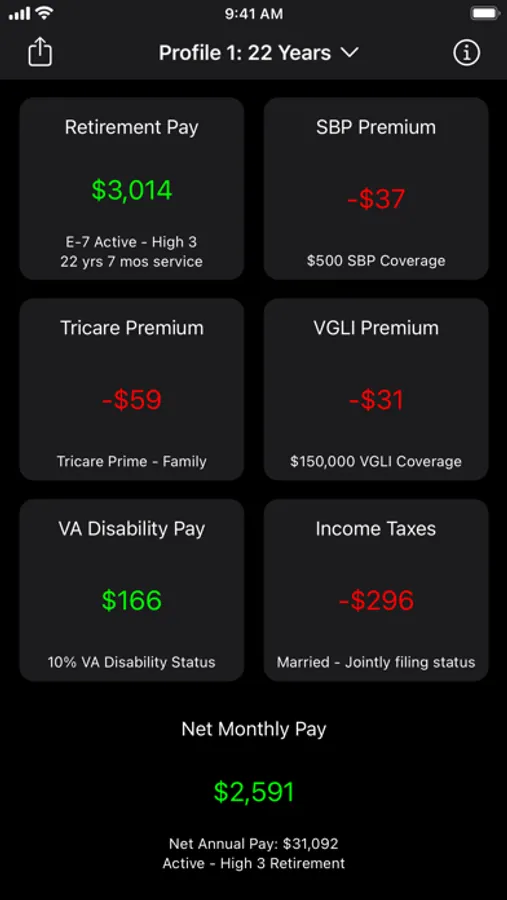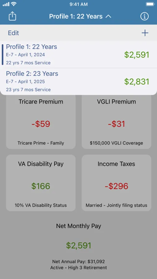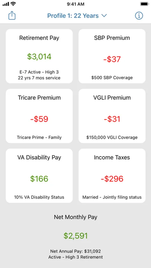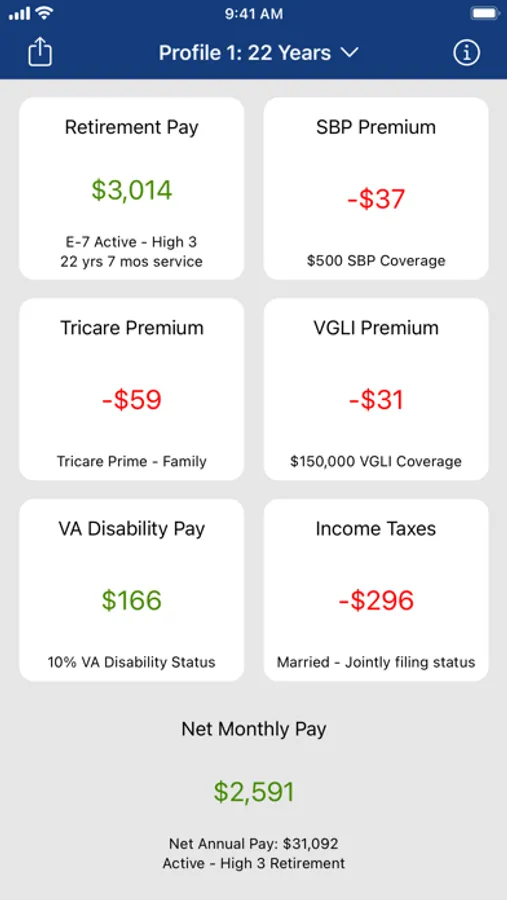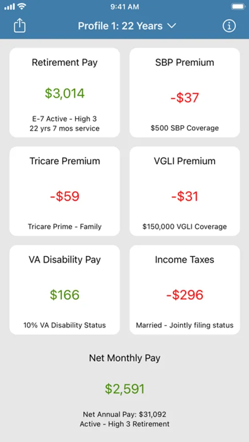 Military Retirement is a stand alone application intended to assist military personnel from all branches of military service by informing them of their benefits upon retirement from military service. Military Retirement gives assistance by calculating an estimation of retirement pay based on the data you enter. This data is secure and does not leave your device and is not tracked in any way. Military Retirement incorporates highly detailed algorithms to calculate your retirement pay to the highest level of accuracy possible. Compare multiple scenario options to determine which retirement option is best for you.