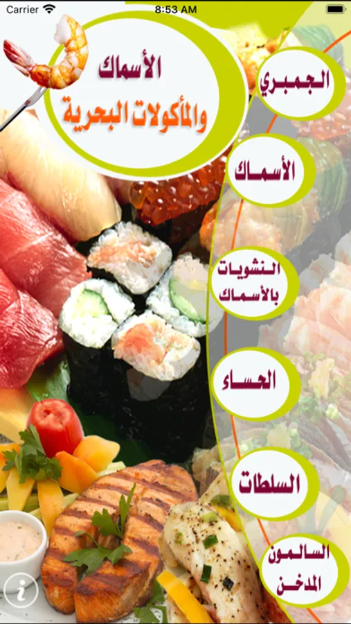 الجمبري ، الاسماك على انواعها ، الحساء، السلطات ، السالمون المدخن مع:
