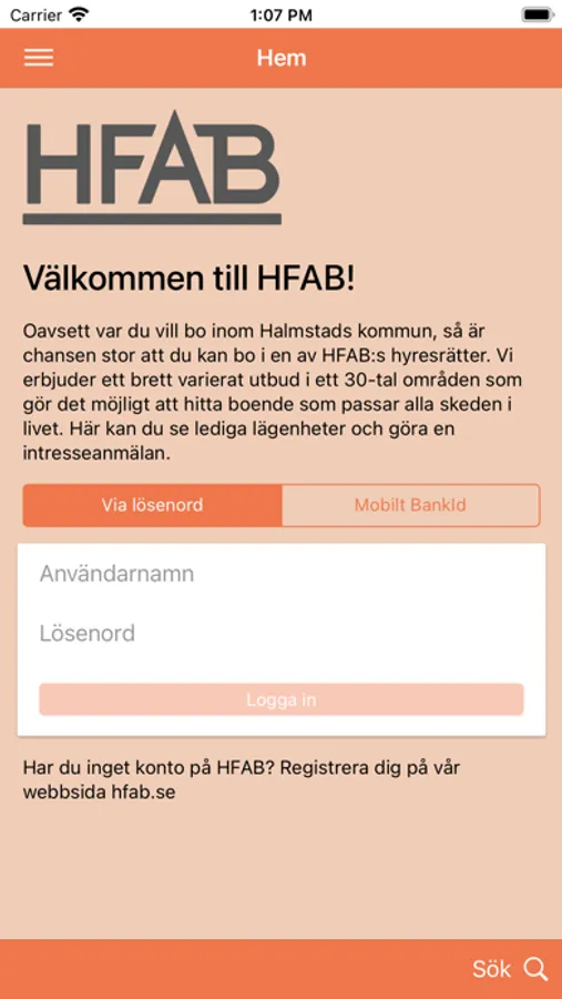 För att kunna registrera intresseanmälningar och svara på erbjudanden behöver du vara anmäld som sökande på HFAB:s hemsida. Inloggningsuppgifterna är desamma som för ”Mina sidor”.
