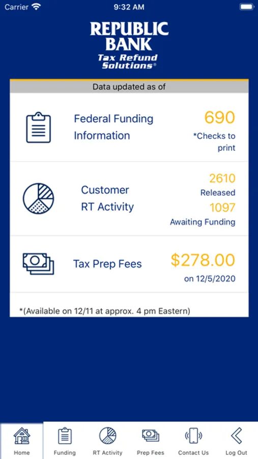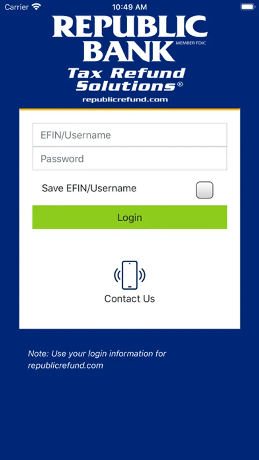 For tax preparers partnered with Republic Bank Tax Refund Solutions, this Mobile App for iPhone®, iPad® and iPod Touch® is a great way to stay updated during tax season! Simply log in with the EFIN and Password you use to access the Tax Information Center (TIC) on republicrefund.com.