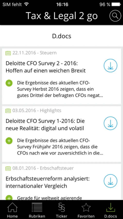 The Deloitte Tax App gives you access to an extensive range of specialist articles on current tax topics published on areas such as corporation tax, international tax law, indirect taxes/customs duties, employee taxation, procedural law, tax reporting, international assignments and human resources, as well as transfer pricing. English-language articles can be found in the section German Tax and Legal News.