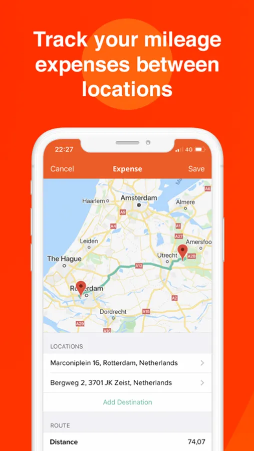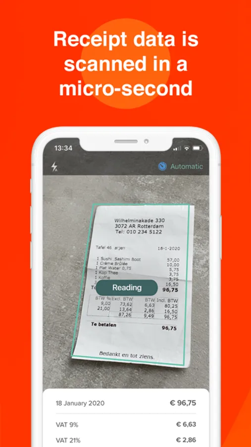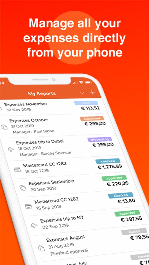 • Employees can directly add expenses and throw away the original receipts. Expenses are locally stored and are synchronised as soon as there is an internet connection. When an expense is approved or disapproved the status of the expense is visible in the app. This way your employees are always up to date about their expense reports.