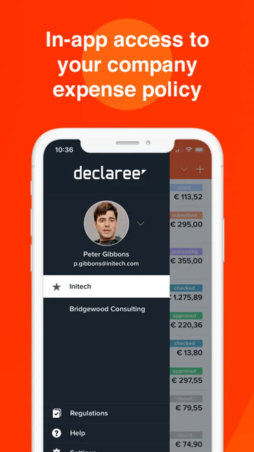 • Using the Declaree smartphone app, employees can submit their expenses on the go. Add receipts and other expenses through the application and immediately place them in an expense report on the right categories and projects.