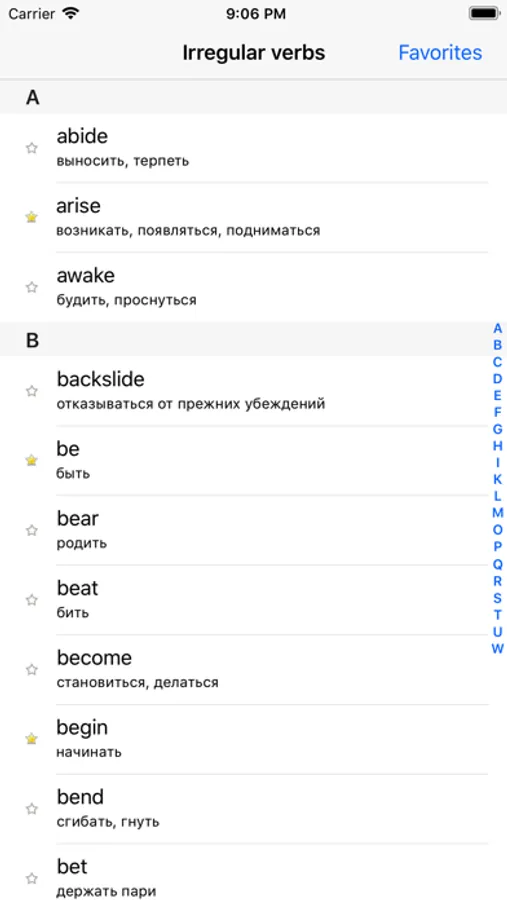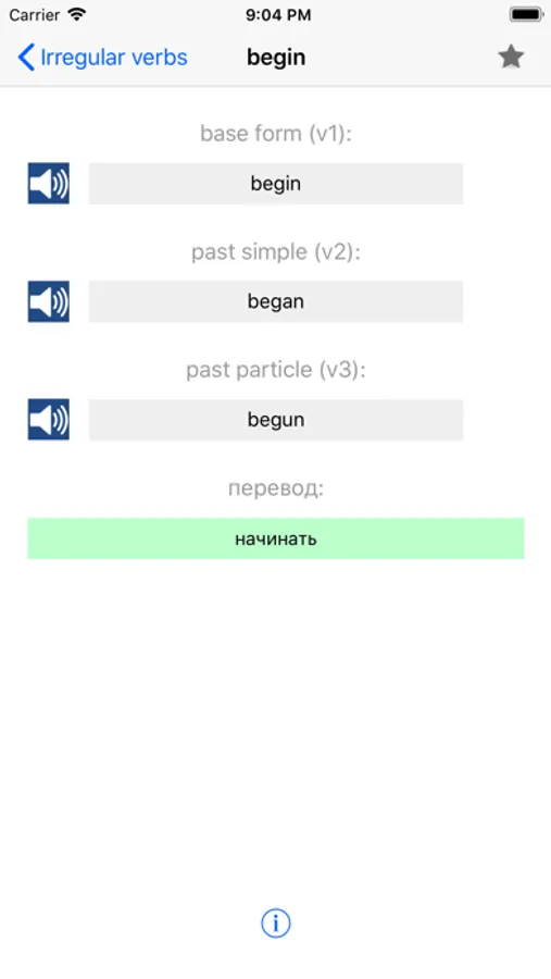 Как известно, неправильные глаголы не подчиняются правилам, их просто нужно выучить наизусть. В этом приложении - таблица из 260 популярных английских неправильных глаголов (большинство из которых озвучено) с возможностью быстрого поиска по первой форме глагола.