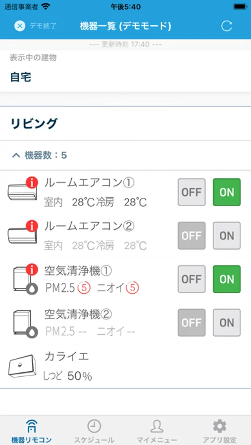 ■家の中でも外出先でも、自在にエアコンや空気清浄機やサーキュレーターの操作が行え、お部屋の温度や空気の状態を確認できます。