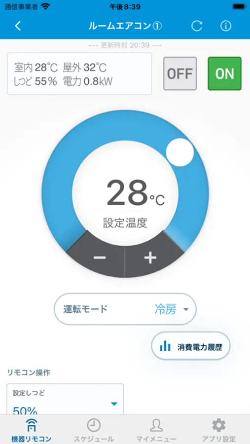 ・エアコンが感知したお部屋の温度・湿度、室外の温度が確認できます。消し忘れや異常もスマホにお知らせ。
