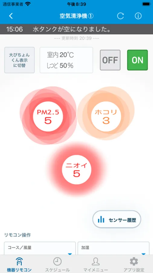 ・空気清浄機が感知したお部屋の温度・湿度、ホコリ・ニオイセンサー情報が確認できます。水タンクの給水タイミングや異常もスマホにお知らせ