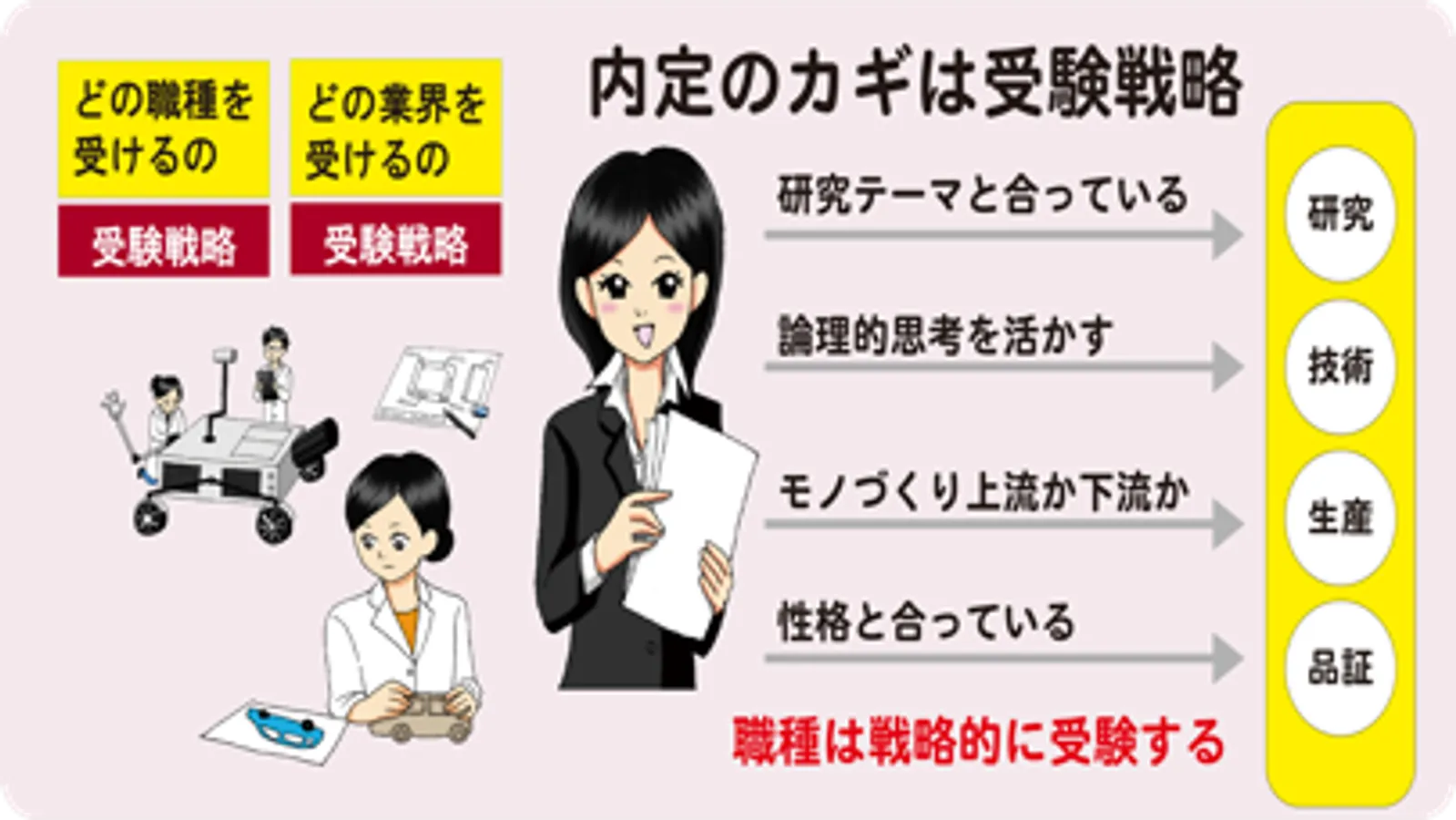 研究概要、理系職種、推薦応募と自由応募など、理系に特化した就活ノウハウブック機能も充実