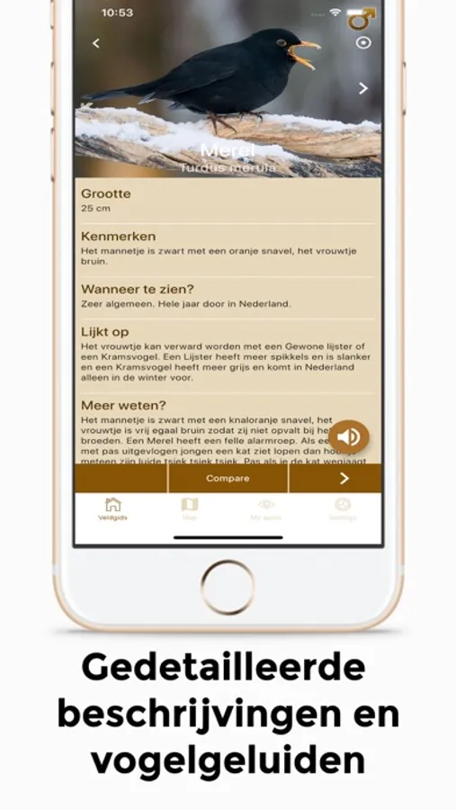 Let op met afspelen van vogelgeluiden in de natuur. Vooral in het voorjaar reageren vogels hier sterk op en dat is verloren energie. Echte kenners nemen oortjes (koptelefoon) mee het veld in. Eén oor voor het luisteren naar de vogel en het andere voor de app. Geniet van de natuur!!