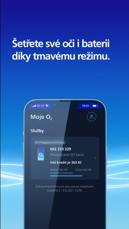 Naši aplikaci Moje O2 děláme jednoduchou a přehlednou, aby se vám jednoduše a rychle ovládala. Aplikaci si můžete přepnout do oblíbeného tmavého režimu. Umí anglicky a ukrajinsky.