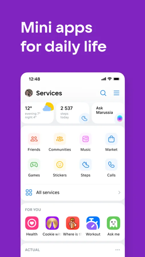 VKontakte unites tens of millions of people by offering unlimited features for communication, dating, entertainment, business and sharing news from anywhere around the world. On the app, you can listen to music, watch videos and clips, keep track of your health, play games, and shop.