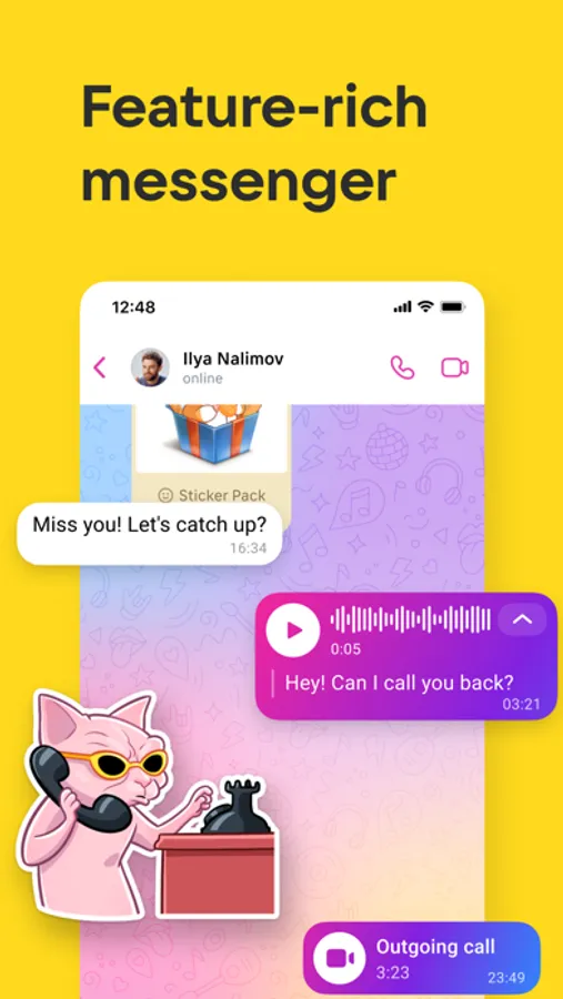 Stay in touch with friends and family. In the messenger, you can chat in group chats and private messages with both friends on VKontakte and people from your phone’s contacts. Bring together an unlimited number of people in video calls, all for free with no time limits.