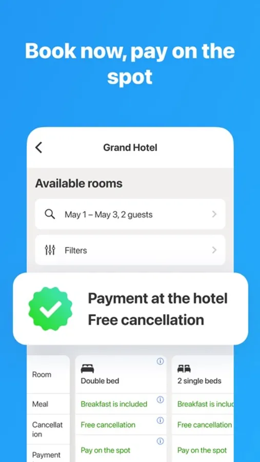 Users may select the filters and choose accommodation based on a large number of parameters: type, location, cost, size of the discount, payment type (online or in the hotel), whether there is a kitchen, balcony, etc. We do everything to ensure our clients receive full information about the hotel in order to help them decide.