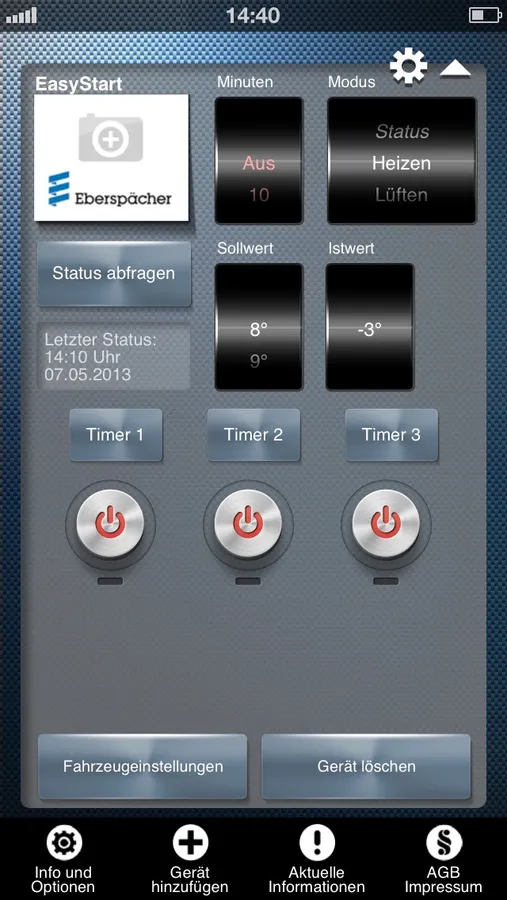 The official Eberspächer app is free of charge and enables the convenient operation of one or more Eberspächer pre-heaters via your Smartphone. Access the Eberspächer pre-heater in your vehicle conveniently and quickly from anywhere in the world. Or control the pre-heaters in a fleet of up to ten vehicles with a single Smartphone.