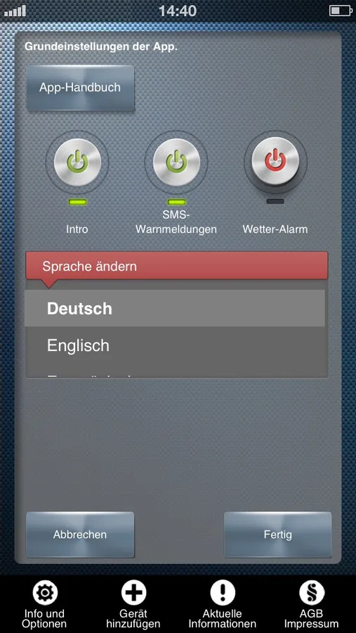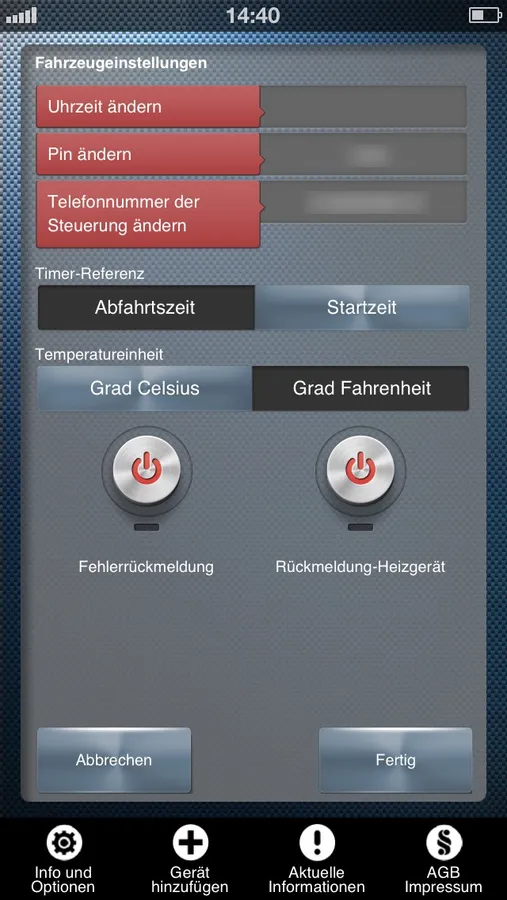 If you have activated the feedback feature in “Vehicle settings”, each time you send a text message to your heater, your heater will send you feedback by text message, which must be copied into the app. When the feedback text message arrives, tap the note (text message) at the top of the screen and copy the text to the clipboard. Double click on the main field at the bottom centre of the iPhone to return to the app. The feedback message is automatically copied to the app by touching the “Finished” button.