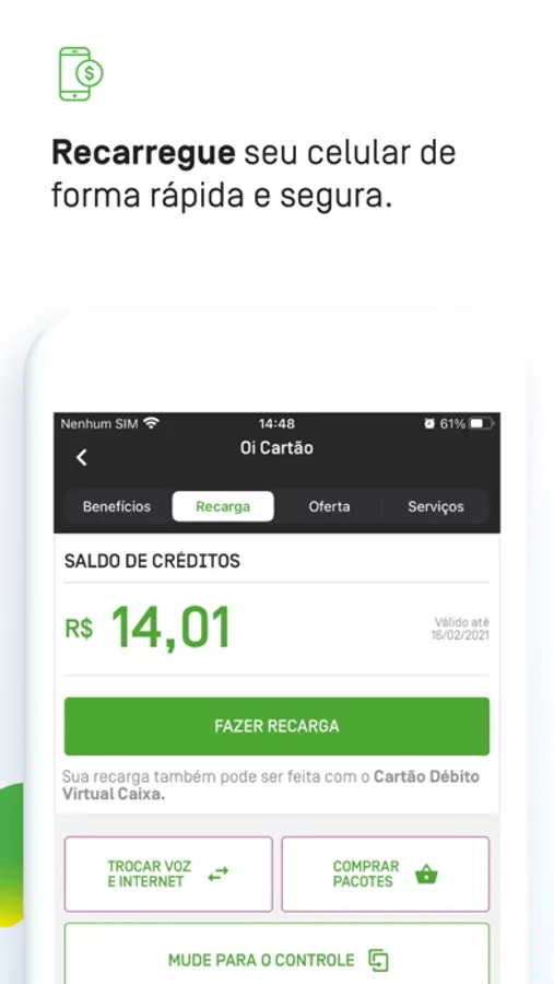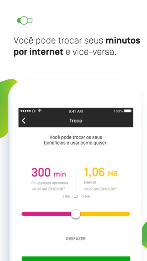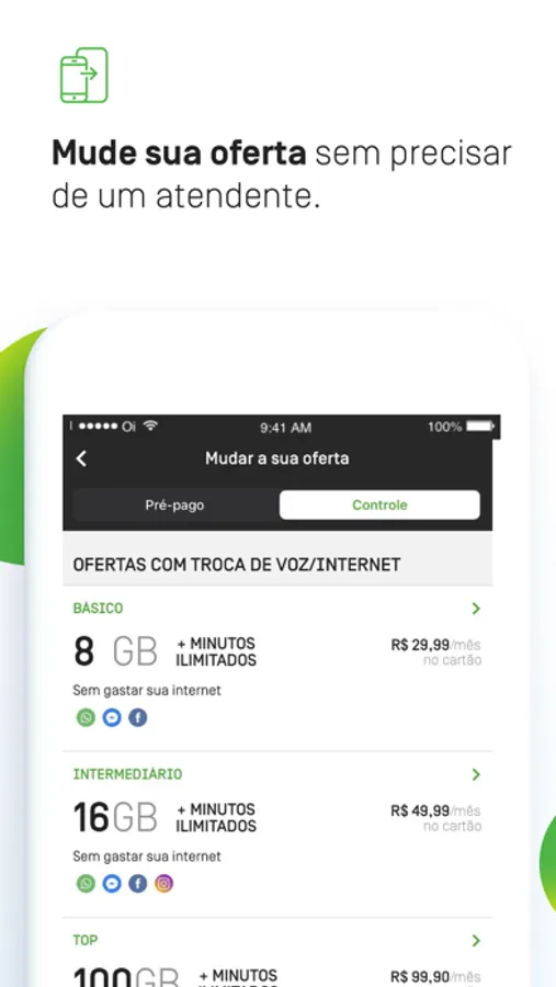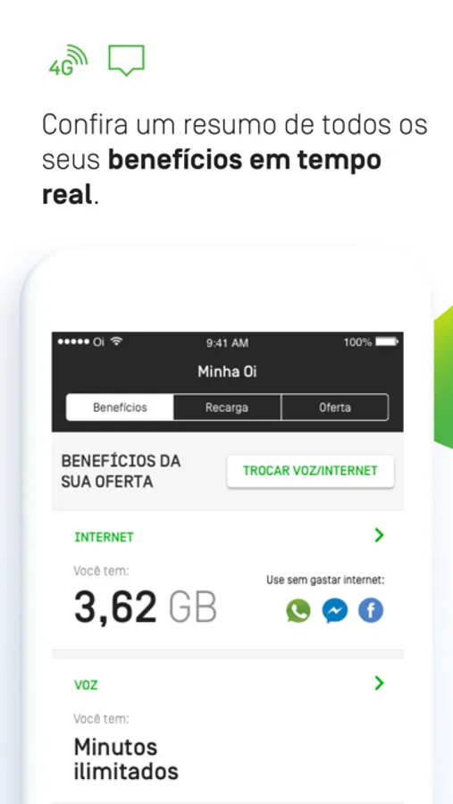 Consulte o saldo de sua recarga e benefícios em tempo real e decida como utilizá-los. Com a opção de troca de benefícios você poderá trocar minutos por internet e vice-versa. Troque sua oferta ou, se estiver sem crédito ou com benefícios expirados, adquira-os realizando uma recarga com cartão de crédito ou comprando pacotes adicionais de dados, voz ou SMS.