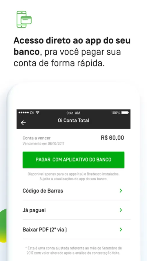 Acompanhe sua situação financeira com a Oi e, se precisar, acesse o código de barras para pagar onde quiser, inclusive, direto pelo app do seu banco, instalado em seu celular. Se quiser mais detalhes sobre o que está sendo cobrado, é possível baixar PDF (2ª via) da conta e entender o detalhe dos seus gastos. Se quiser mais conforto, faça adesão ao débito automático e/ou ative a conta online, assim receberá sua conta por e-mail todo mês, sem papel e sem precisar ligar para o atendimento.