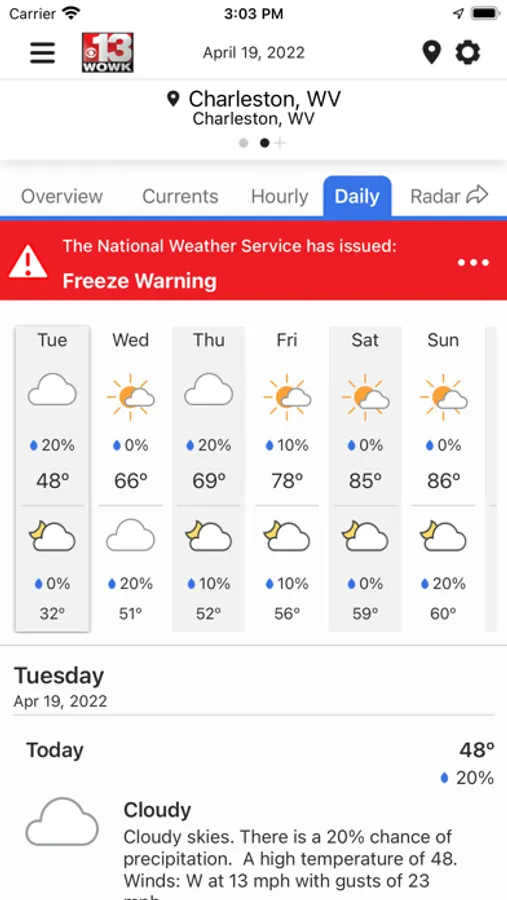 This app can save your life during severe weather! Get all the weather information you need, severe weather warnings, from the trusted source — Spencer Adkins and the StormTracker 13 Weather Team. Get instant access to your 7-day forecast, HD Dual Live Doppler interactive radar and the "Predictor" forecast model in this FREE app.