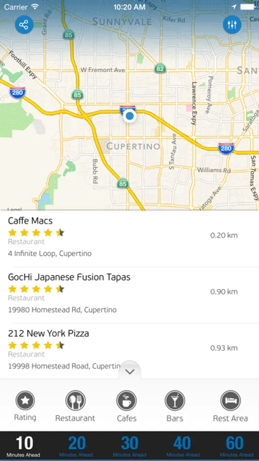 Highway Dining App will show you the available restaurants in next 20,30,40,60 minutes based on the driving direction and speed !!!