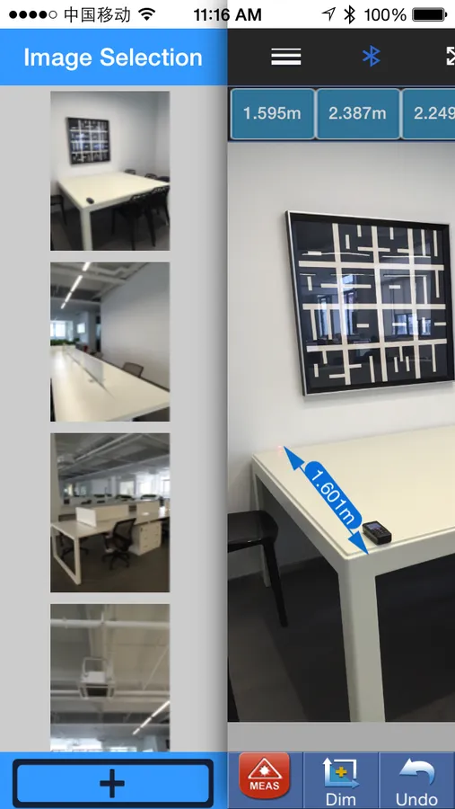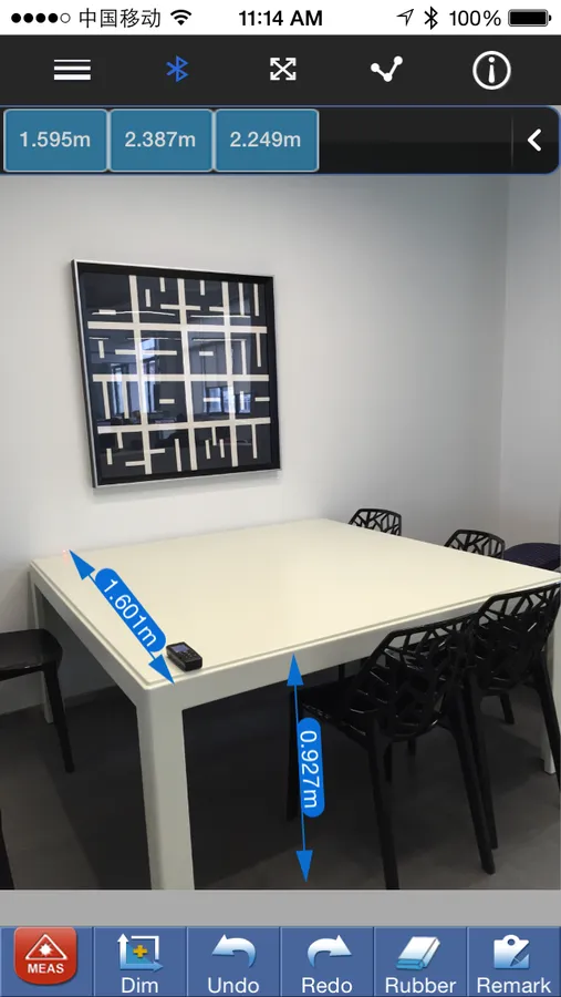 2.The measured data from Laser Distance Meter can transfer to iPhone via Bluetooth and display in the scene.