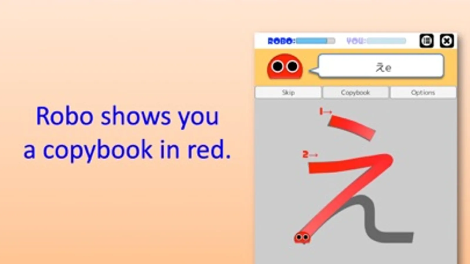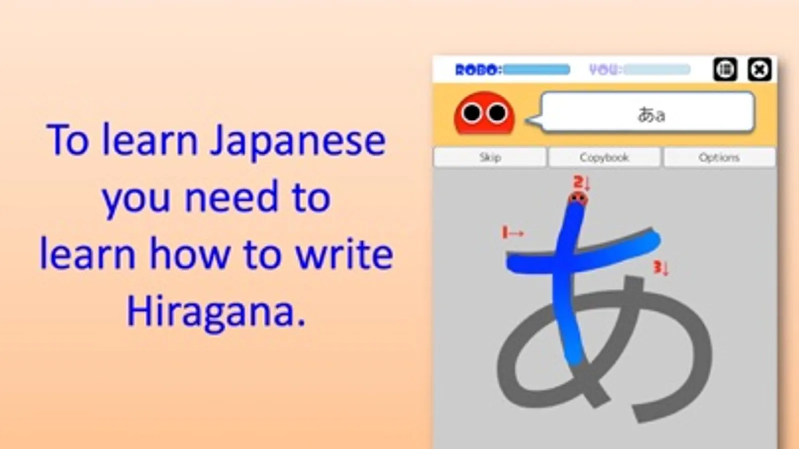 To learn Japanese you need to learn how to write hiragana and katakana. The best way to learn them is to practice writing them over and over but this can be boring. Instead, have fun and use this game to practice the correct way of writing kana - and beat the Robo!