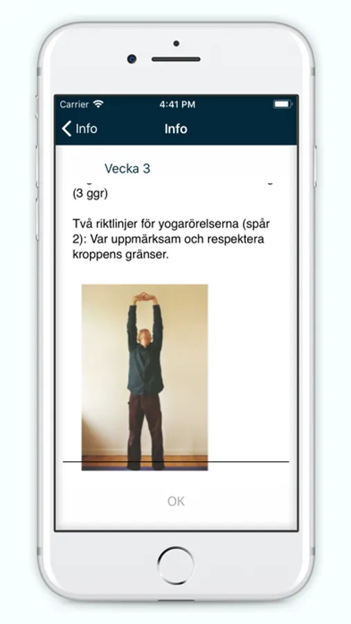 Med appen följer korta och pedagogiska texter som beskriver programmet vecka för vecka. Yogaövningarna och de olika sittpositionerna illustreras med fotografier.