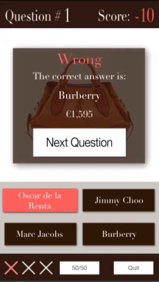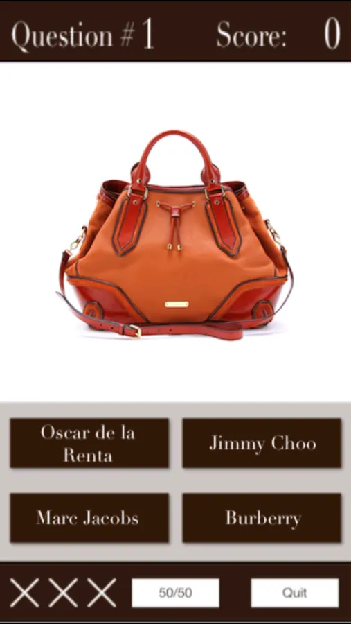 Have you ever found yourself looking at other women's handbags and trying to guess who the designer is? It's fun, isn't it? Name The Designer is exactly that. One of the 500 handbags is displayed and you have to name the designer from a list of 4 possible designers.